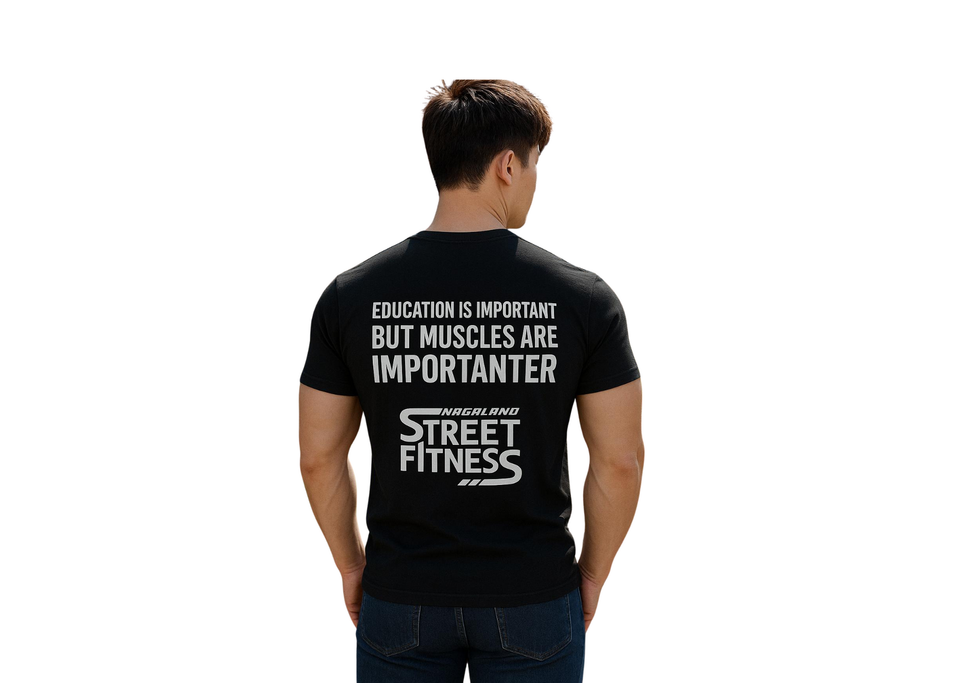 The “Muscles Are Importanter” Tee brings in the laughs without skipping the reps. With the bold statement — “Education is important, but muscles are importanter” — and the Naga Street Fitness logo below, this tee is a crowd-favorite at street workouts, gyms, and wherever serious strength meets good humor.